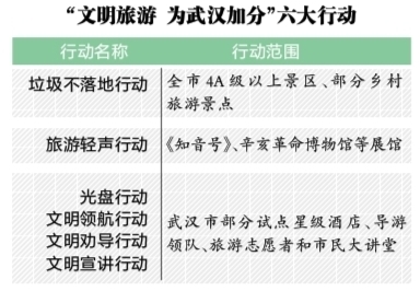 今年,“文明旅游 为武汉加分”发起六大行动,规模和力度都属空前。武汉市旅游委负责人表示,在全域旅游背景下,文明旅游也迎来空前发展机遇。通过六大行动,将尝试在旅游产业各个链条发力,共同推进文明旅游,使活动效果达到最佳。