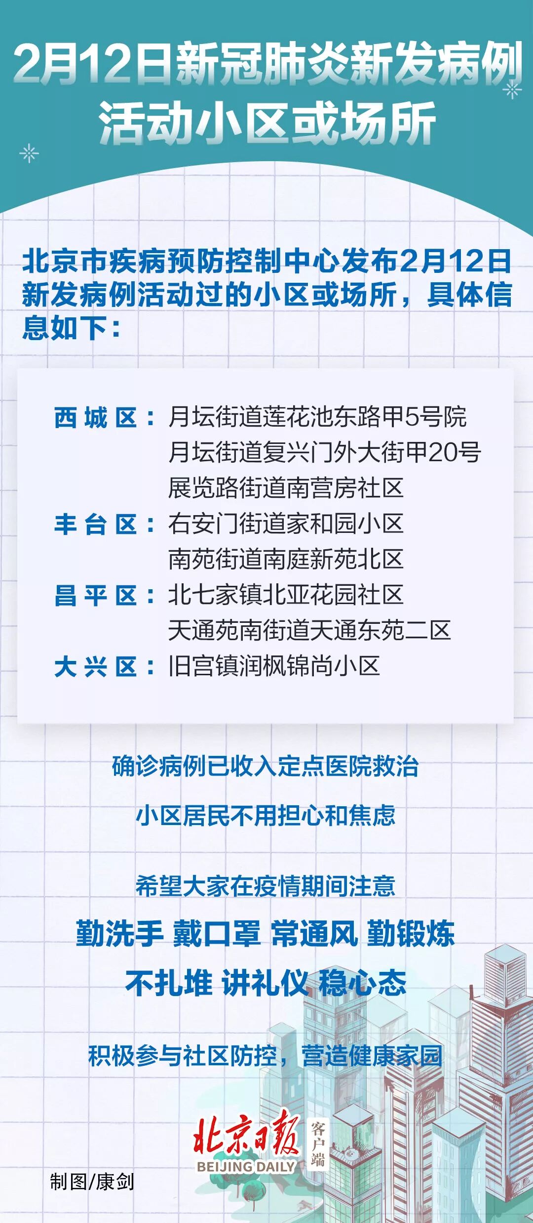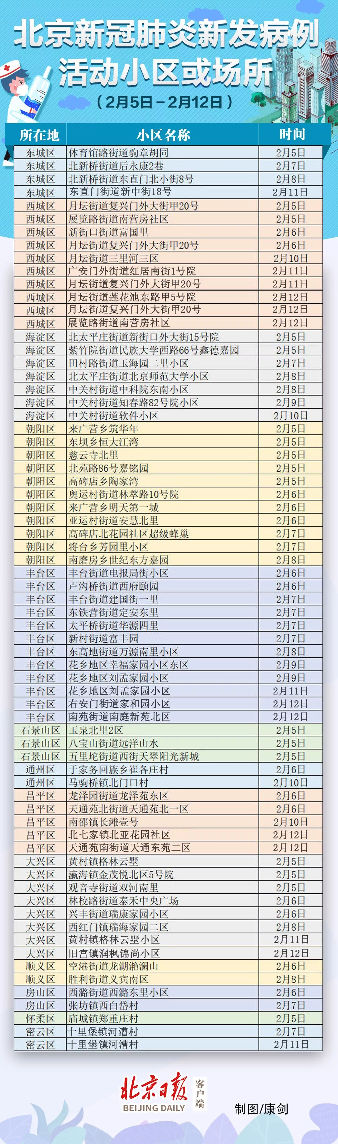 以下是2月5日至2月12日,北京新冠肺炎新发病例活动小区或场所: